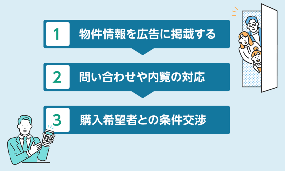 広告はインターネットのポータルサイトなどへの掲載のほか、チラシの配布や新聞広告などさまざまです。広告を掲載するほかにも、不動産会社が購入を検討している顧客に直接連絡するなどの活動も並行して行います。