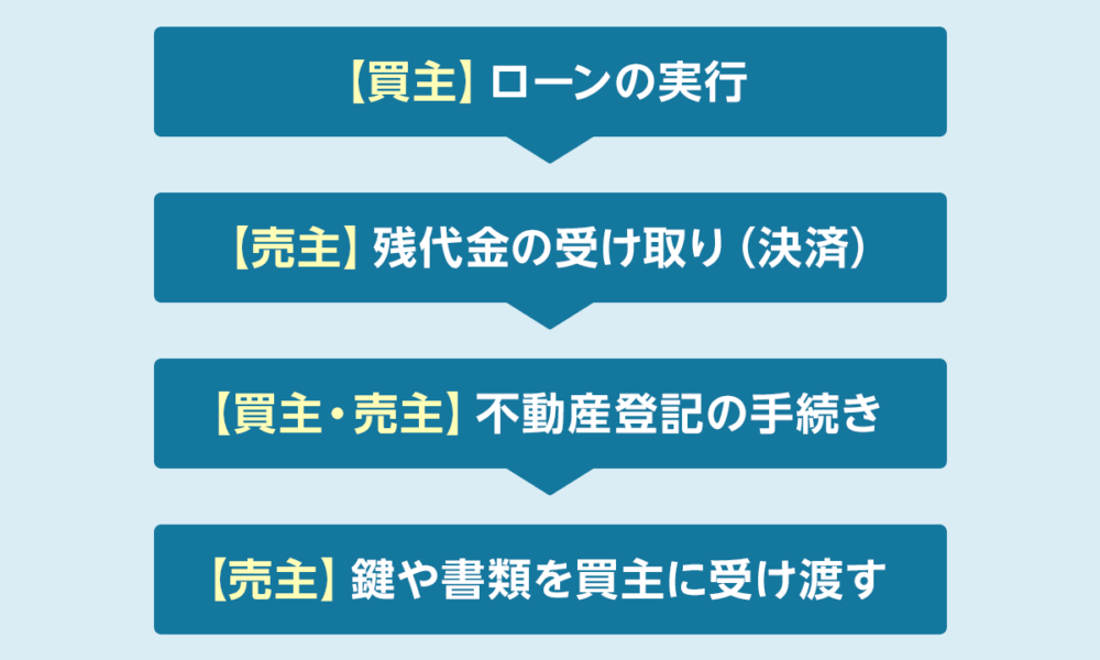 買主が住宅ローンを利用する場合は、その融資の実行と同時に行われることが一般的です。残代金の受け取りが完了し、不動産登記の申請が済んだら、物件の鍵や関係書類を買主に引き渡します。