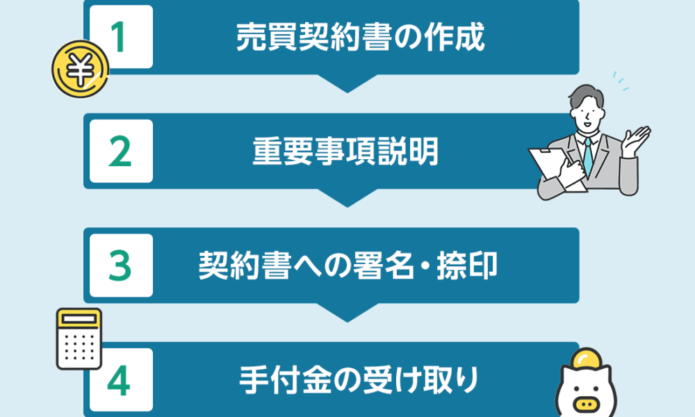 契約書への署名捺印と同時に、買主から売主へ手付金が支払われます。また、契約内容によっては、このタイミングで仲介手数料の一部を支払うこともあります。